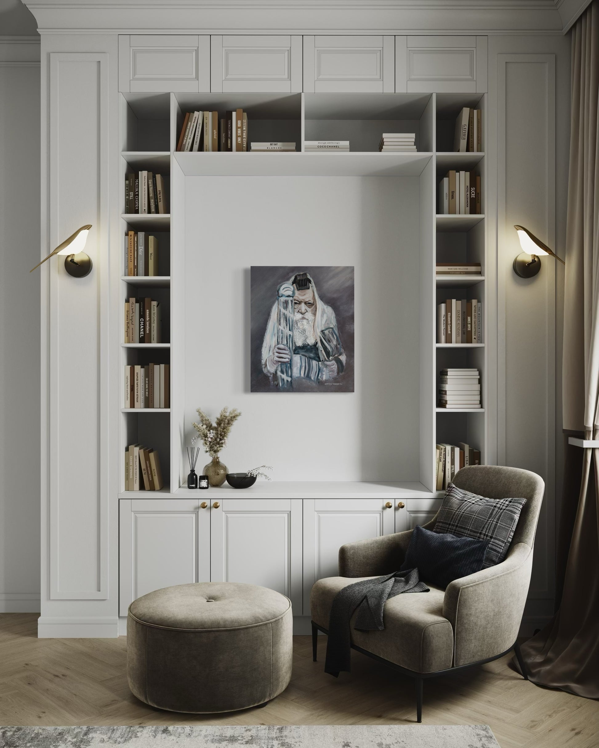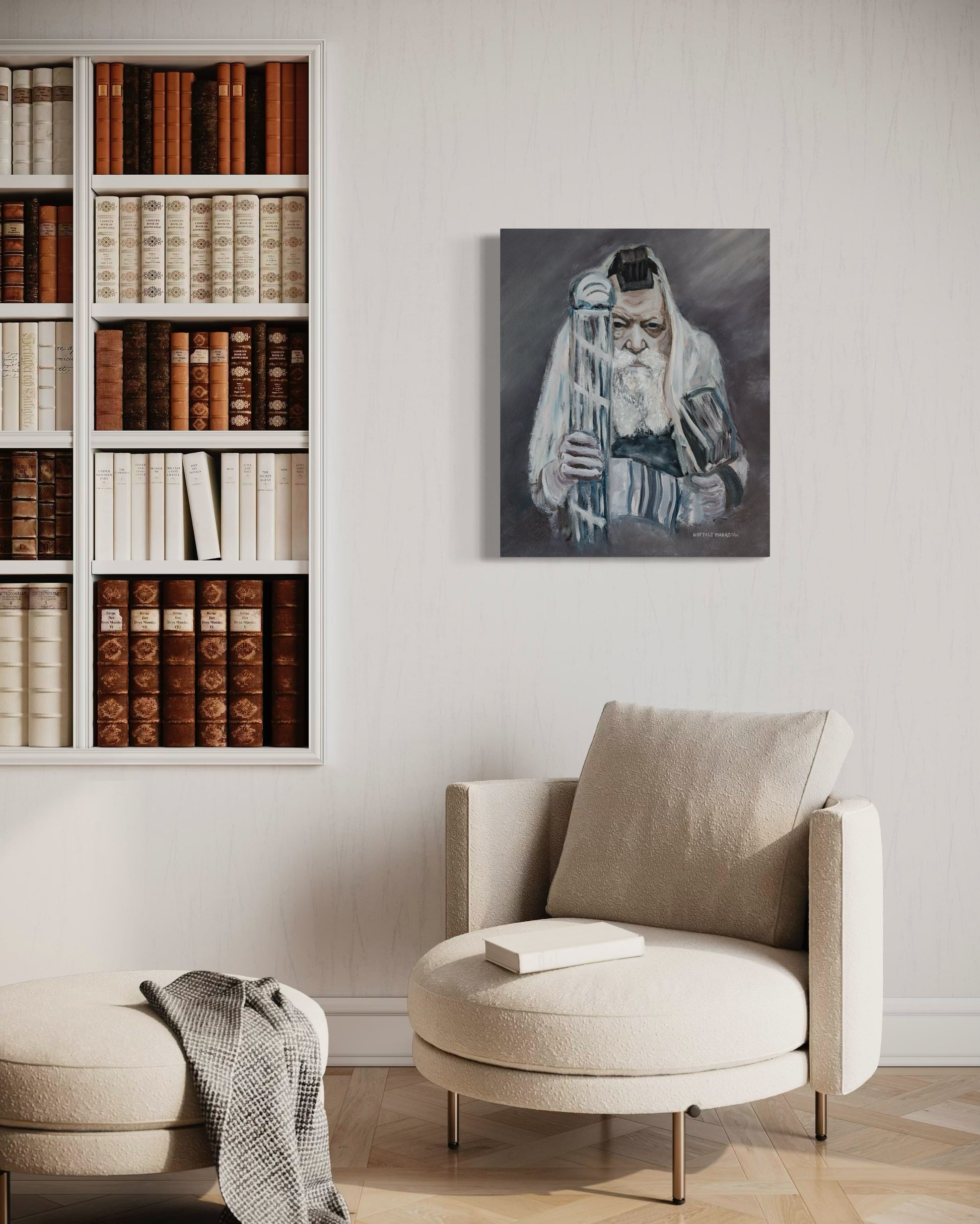 This painting depicts the Rebbe, embodying the spirit of Mordechai, the hero of the Purim story. As the Rebbe exits the Shul, he holds his megila with dignity and purpose, symbolizing his role as a leader and a champion of Jewish values.